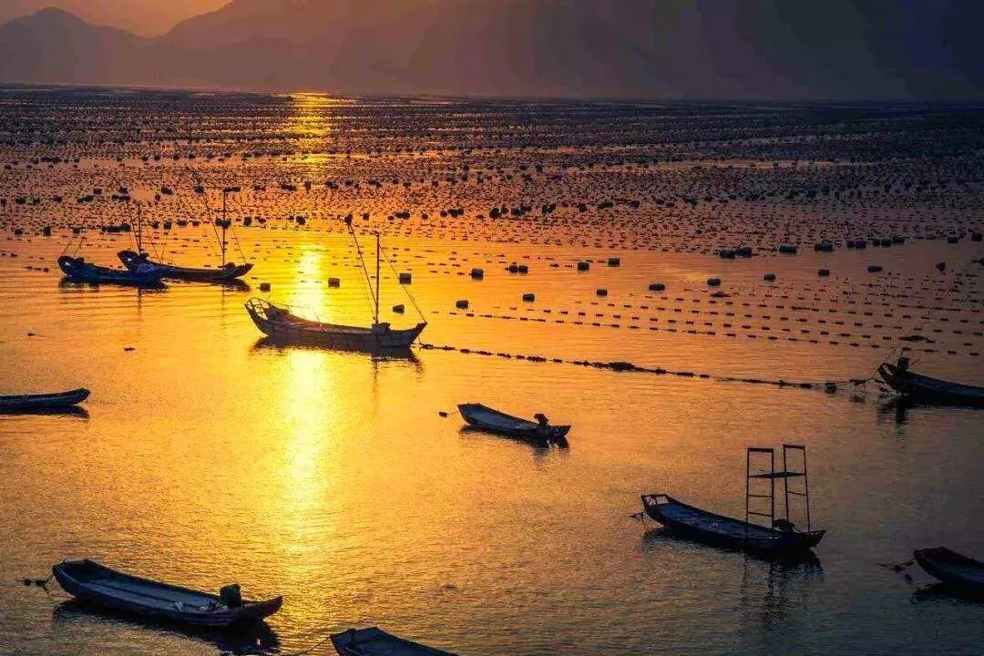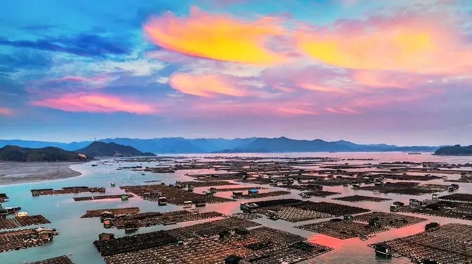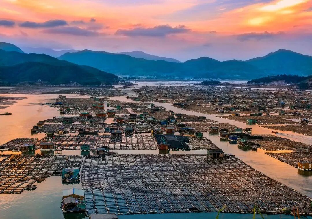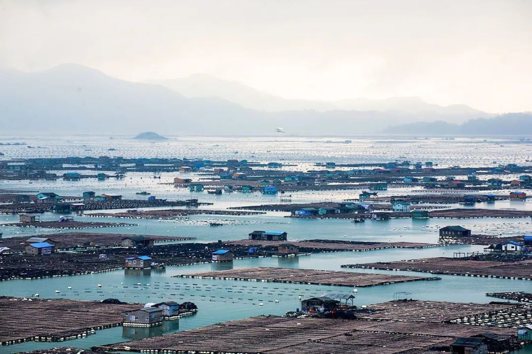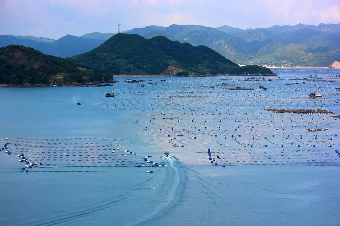 站在东安的小山包上俯视这片海域,辽阔的海域中坐落着无数渔排,星罗棋布,一只只渔船在海面上穿梭,一个个白色或蓝色的浮标整齐地漂浮在海面上,像一幅幅温馨、静谧、富有生机活力的海上田园风景画。