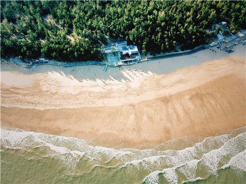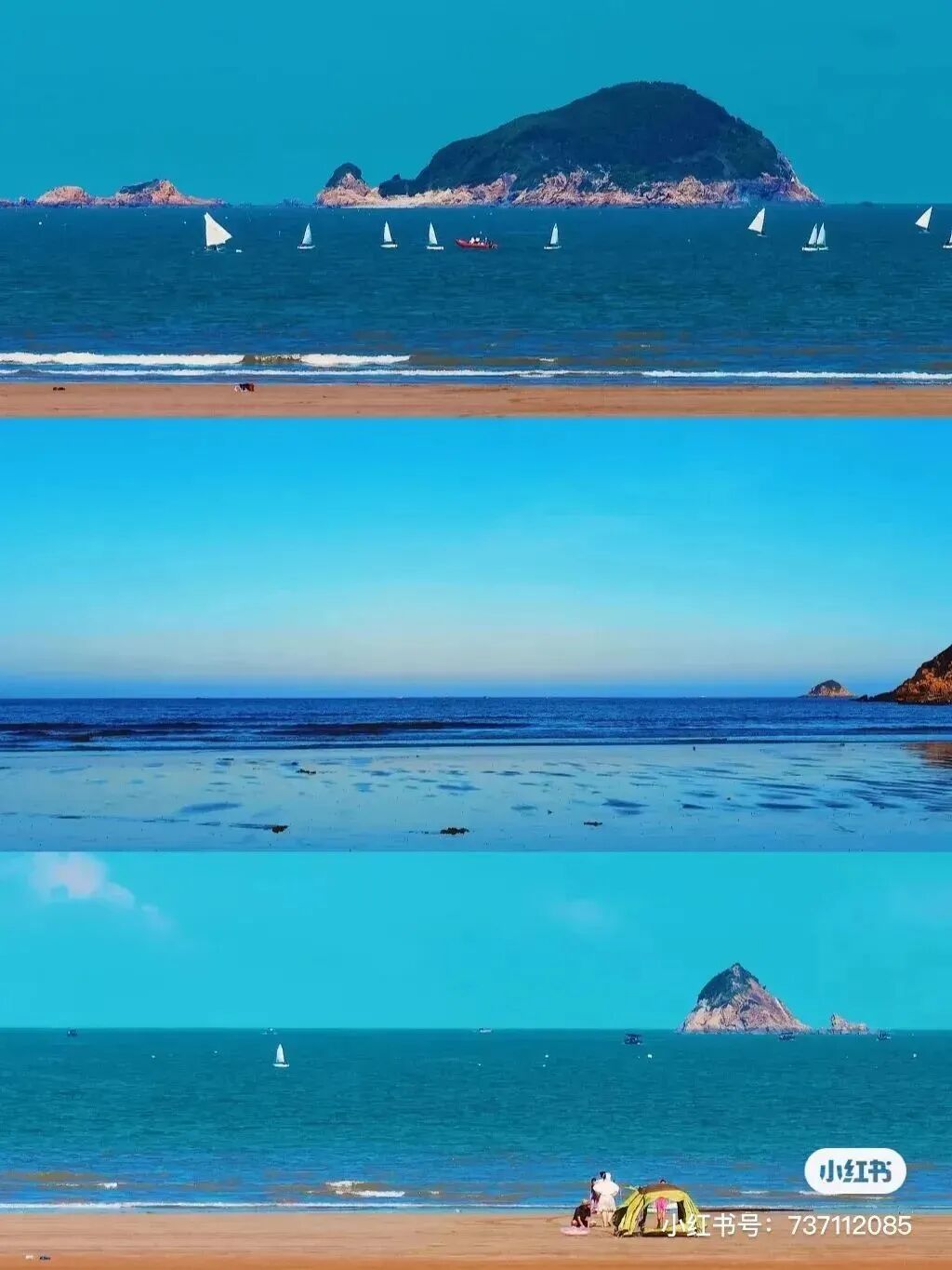 脚踩细沙,耳听波涛,站在沙滩上可以看到远处的笔架山,风光独秀,海天一色。伴随潮水,每天都会有虾蟹贝壳被冲上海浪,幸运的游人常有意外的收获。