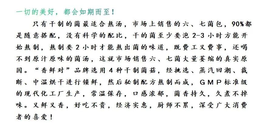 选用4种干制菌菇,经挑选、蒸汽回潮、裁断、中温烘干,通过秘制配方熬制而成,菌菇原汤,好食材 ,超级鲜, 菌香持久,久煮不掉味,老少皆宜。好吃不贵,经济实惠,厨师不累,只要五分钟,时间不浪费。猴头菇汤底养胃又养味。(可用于:火锅、煮汤、煮面、粉)