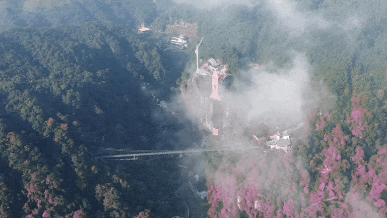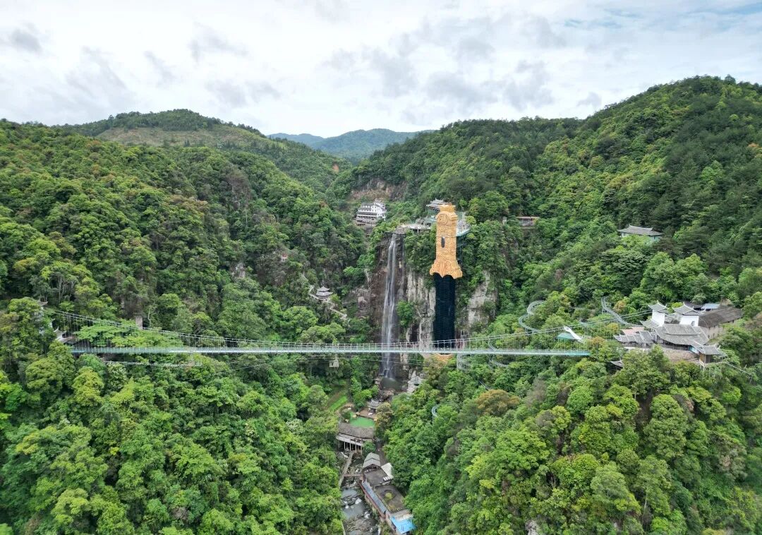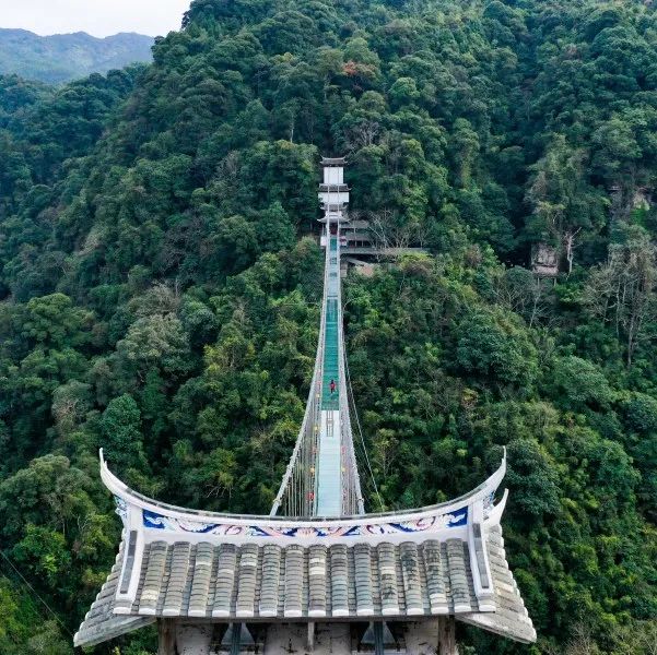 高空极限玻璃天桥,全长268米,垂直高度188米,横跨高洲溪两岸峡谷,地势险要。天朗气清时,可俯瞰峡谷全貌,远观飞流直下三千尺。云雾缭绕时,仿佛步入仙境,朦胧之美如画中游。