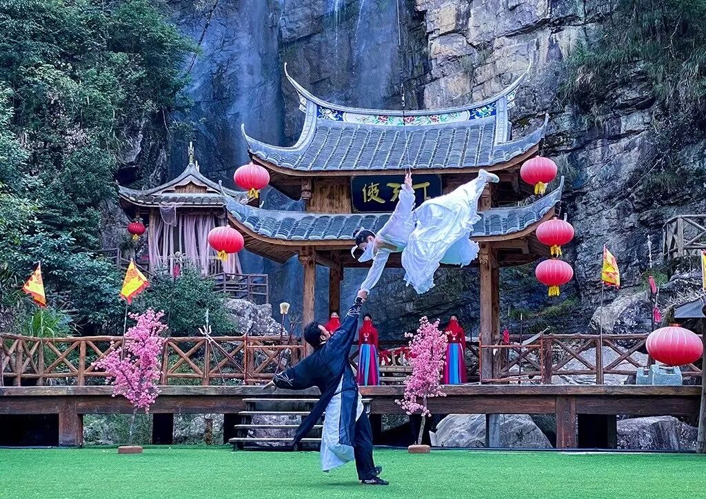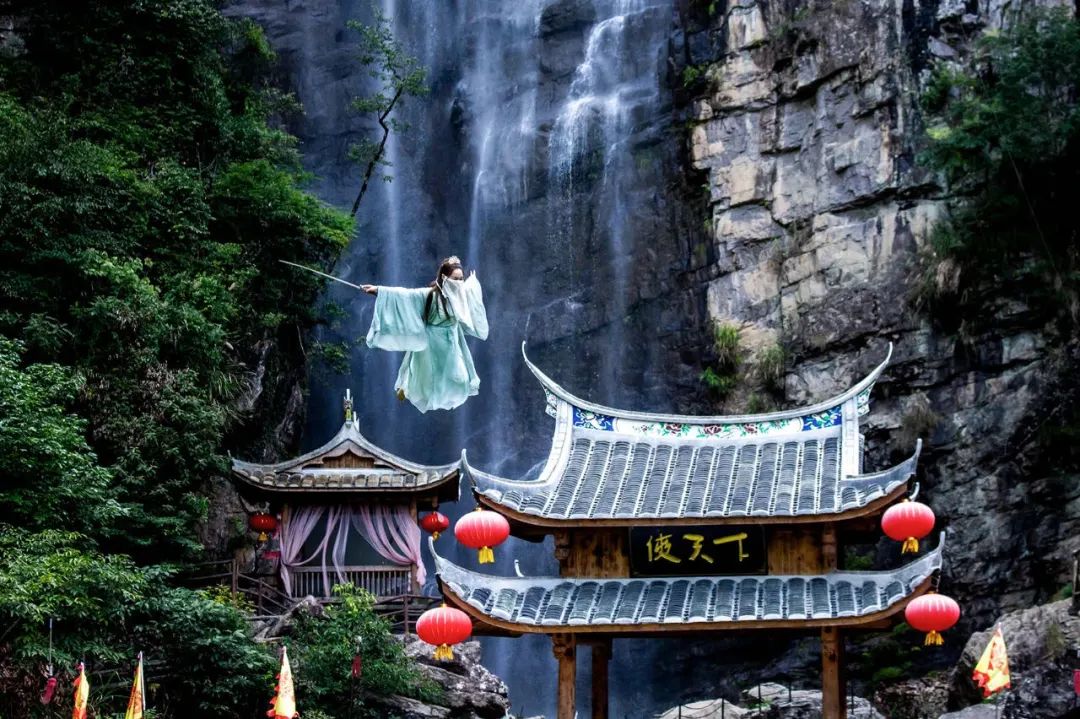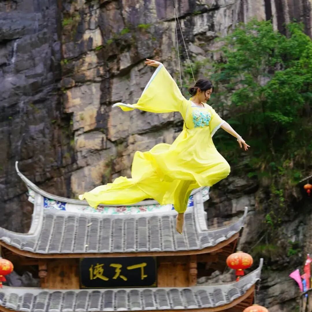 山水实景高空威亚体验,一经推出,火爆全网。可根据自身情况,定制飞行高度,穿上古装吊威亚,实现轻功武侠梦。背倚鹰嘴飞瀑,唯美的山水与飞仙体验的游客和谐成画,成为汉服打卡热门景点之一。
