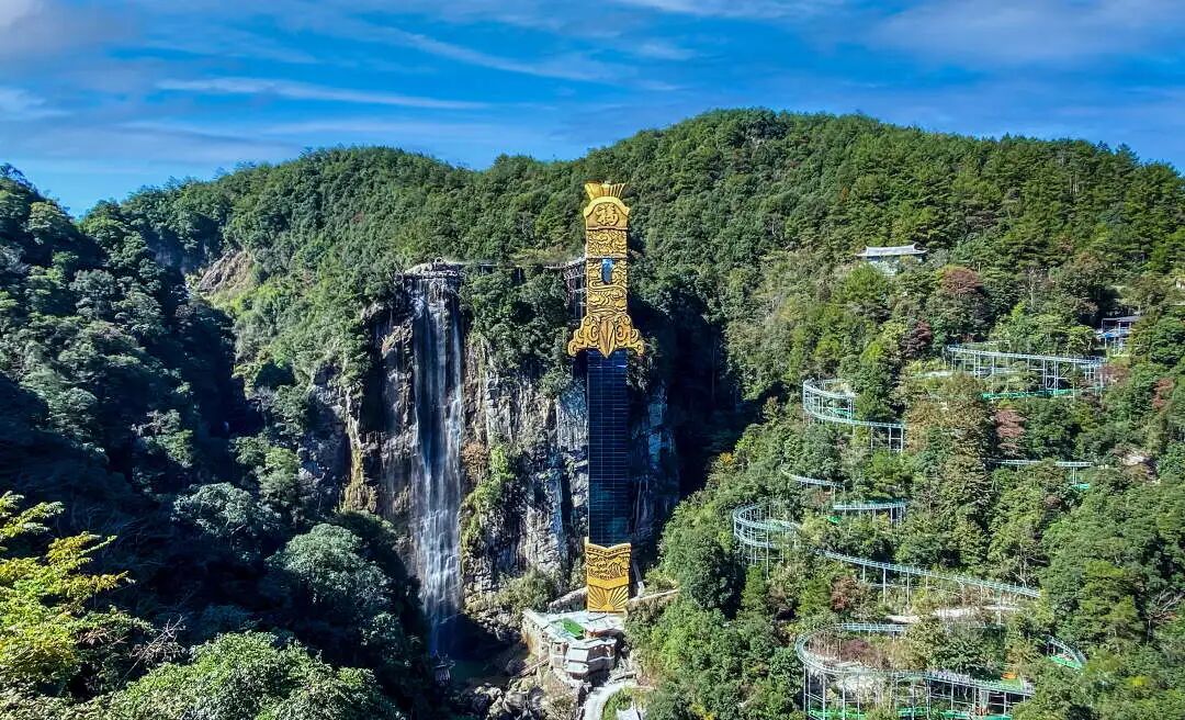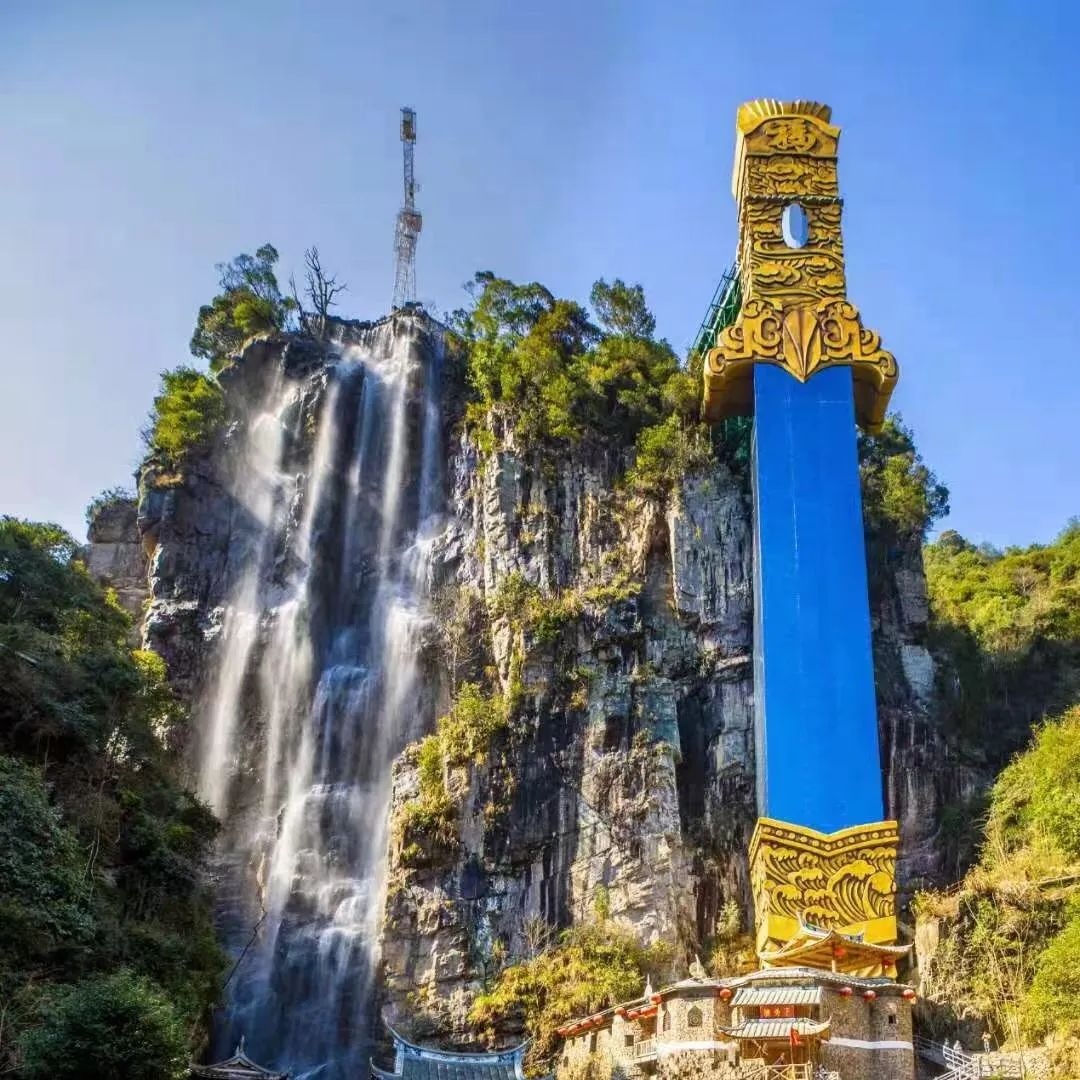 形为神龙剑,内置3台高速电梯,高达168米的玻璃观景电梯,27秒即可升至顶峰,侠文化与自然景观相得益彰,气势雄伟!搭乘悬崖宝剑电梯,省时省力,不用拾级而上便可俯瞰峡谷,刺激的穿越感带你领略天高云阔的震撼!